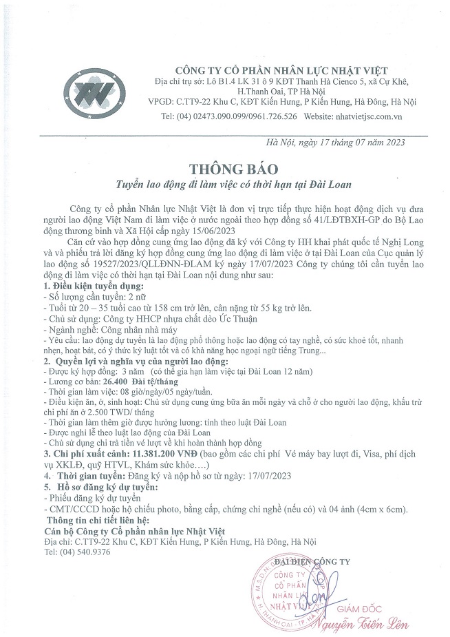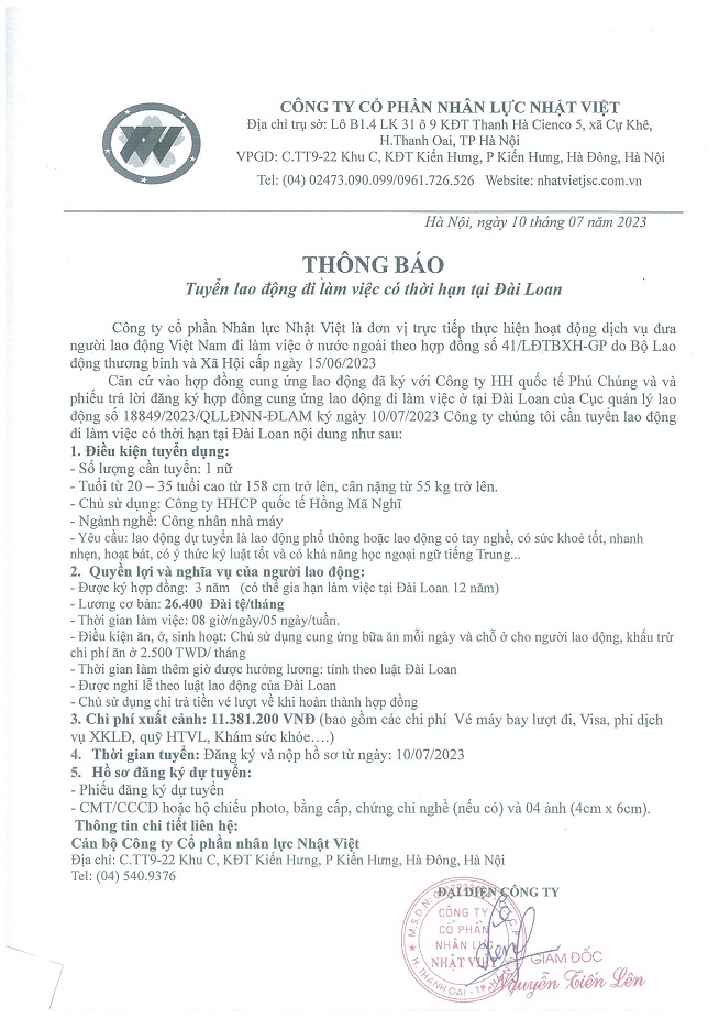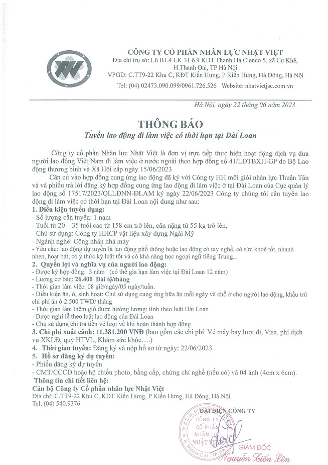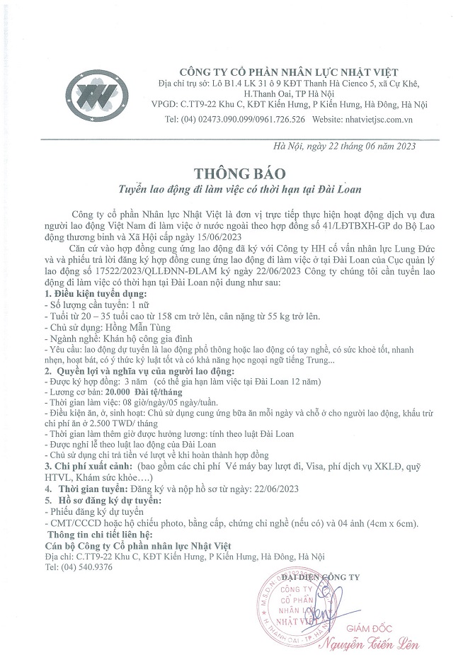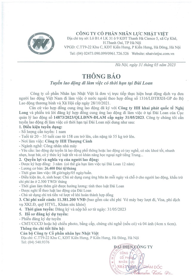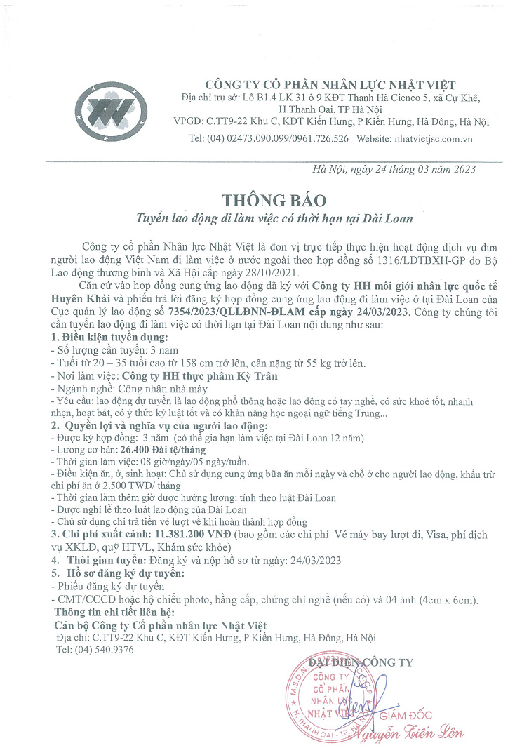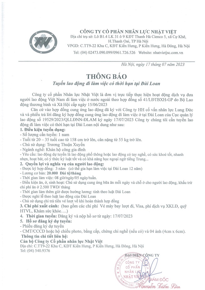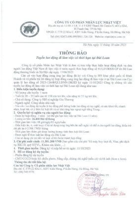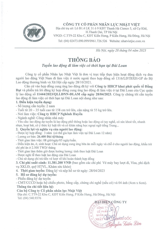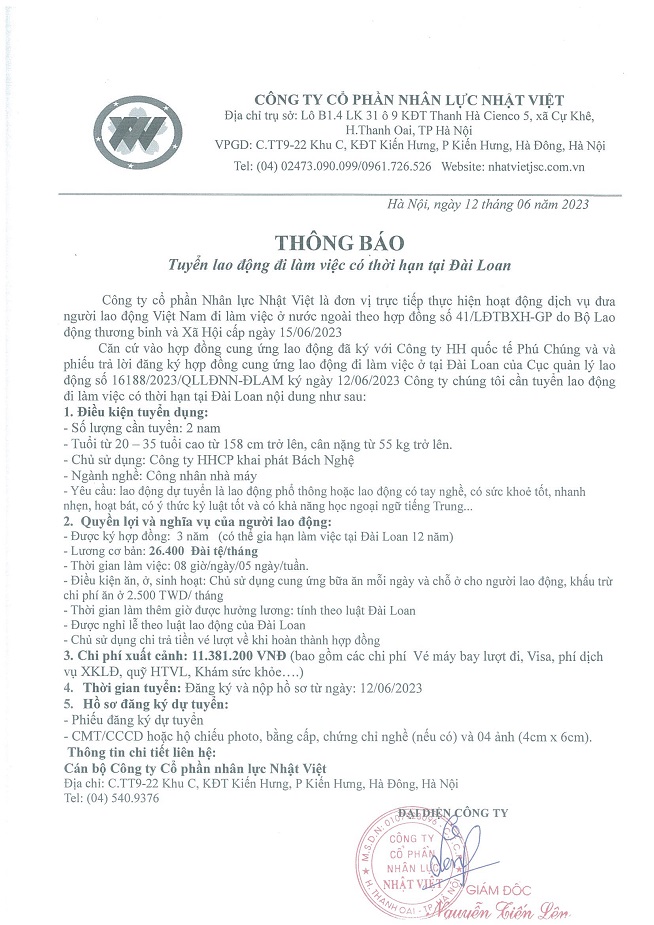 Đơn hàng XKLĐ Đài Loan